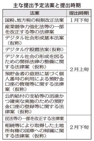 デジタル庁の設置やデジタル社会の形成に向けた基本理念、基本方針を定めるデジタル関連法案の提出も2月上旬の予定。同じく2月上旬には、預貯金者の意思に基づいてマイナンバーを利用し、預貯金口座を管理する制度と災害時や相続時に預貯金者やその相続人の求めに応じて預金保険機構が預貯金口座に関する情報を提供する制度を創設する等の措置を講じる「預貯金者の意思に基づく個人番号の利用による預貯金口座の管理等に関する法律案(仮称)」および公的給付の支給等を迅速かつ確実にするためにあらかじめ預貯金口座を登録しておく「公的給付の支給等の迅速かつ確実な実施のための預貯金口座の登録等に関する法律案(仮称)」の提出も見込まれる。